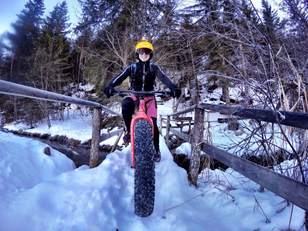 Wir fühlten uns mittlerweile pudelwohl auf unseren neuen Spielgefährtinnen und probierten einiges aus. Balanceübungen lassen sich super auf den Fatbikes durchführen, genauso gut kann man an seinen Bikeskills feilen, z.B. lässt sich die Kurventechnik super im Schnee üben, da man im Vergleich zum Sommer meistens weich fällt, sollte es doch mal schief gehen.