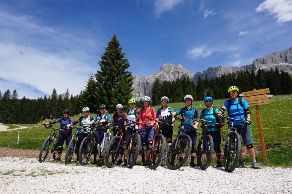 Erfahre in entspannter Ladies-Runde die schönsten Ecken und flowigsten Trails der Dolomiten – zwischen Latemar, Rosengarten und Karer See.